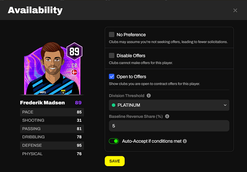 - Set a minimum Division clubs must be registered in in order to make an offer for your player. Clubs from lower tiers than stipulated won’t be able to send in any offers.