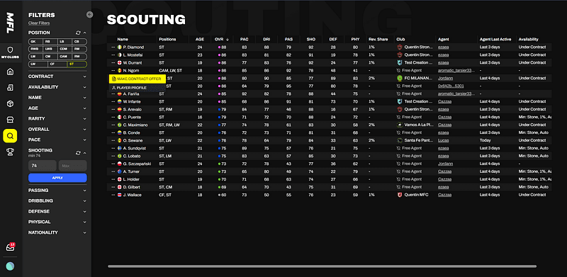 When the Transfer Window is open, you can head to the Scouting page, which contains the full database of MFL Players. You can sort players by availability, skill, position and much more, and make contract offers for players who fit the bill!