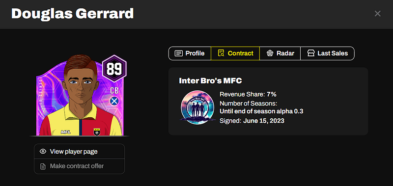 Offering a contract is straight-forward. Just set the proposed revenue share and duration of the contract, and it will be sent to the player’s Agent for review. If approved, the player will join your ranks, be counted toward the 25 player slots in your team, and suit up for your Club for the duration of his contract.